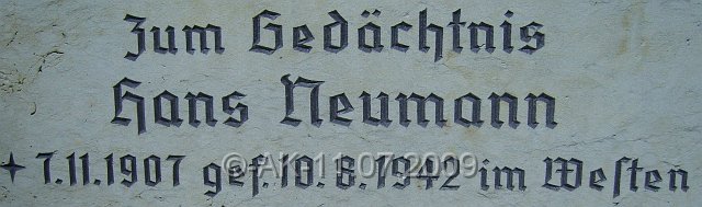 -Soldat- geb.: 07.11.1907 gef.: 10.08.1942 J.Neumann ruht in Lommel/Belgien, Block9, Grab 453.